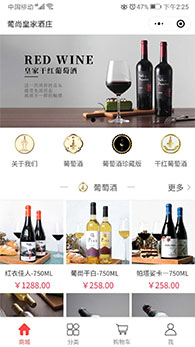 紹興葡尚皇家酒莊小程序是紹興魔方網(wǎng)絡(luò)科技有限公司2019年度開發(fā)的微信小程序,小程序頁面設(shè)計時尚簡潔,是愛品味紅酒和收藏紅酒購買小程序,開發(fā)了首頁商城、分類、購物車、我的中心等等模塊。
